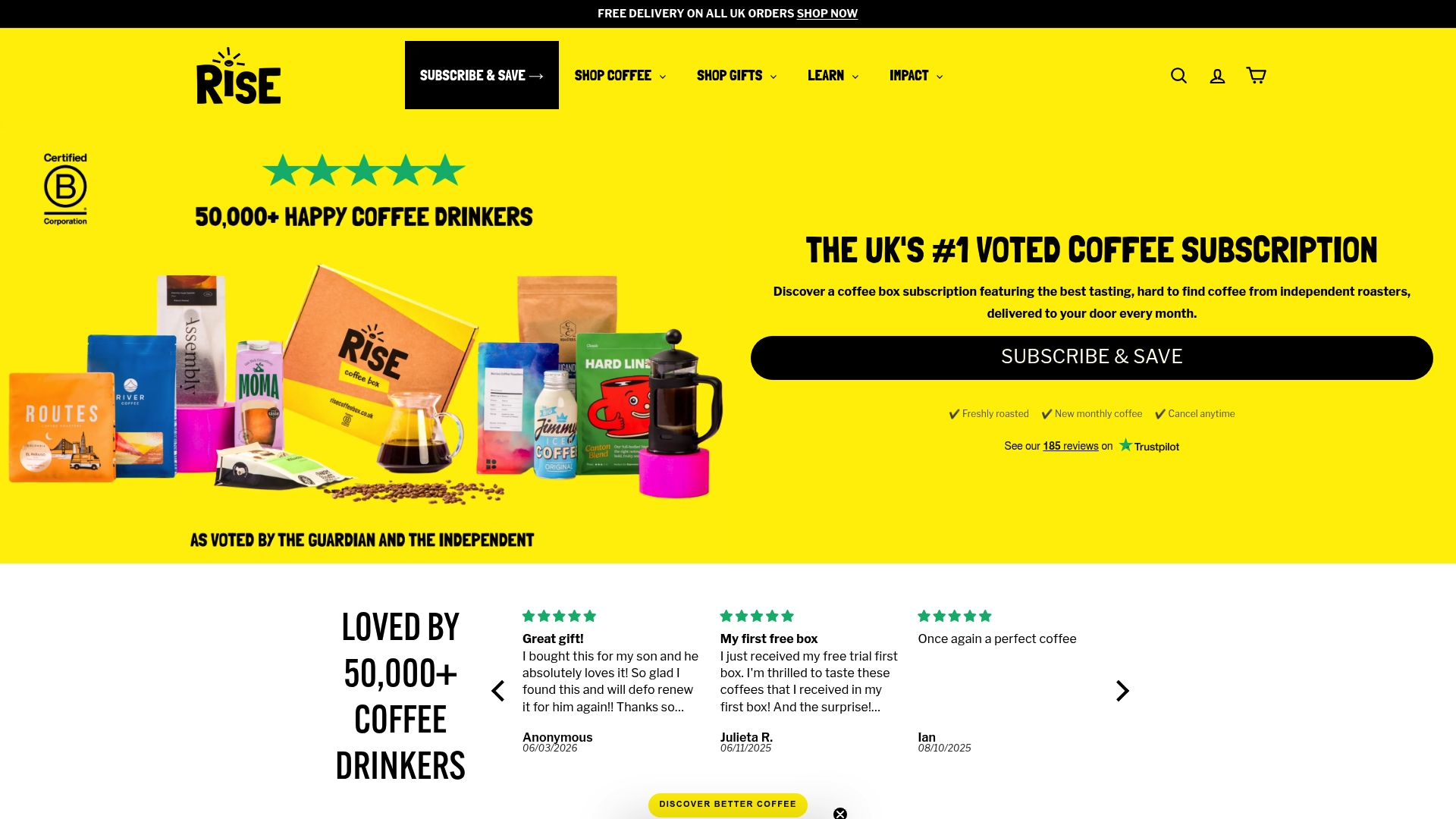 RiSE Coffee is a highly rated speciality coffee subscription that delivers a curated selection of independently roasted beans across the UK. The service pairs high quality coffees with a social mission through the Friendly Coffee Fund, making each delivery feel purposeful and rewarding.