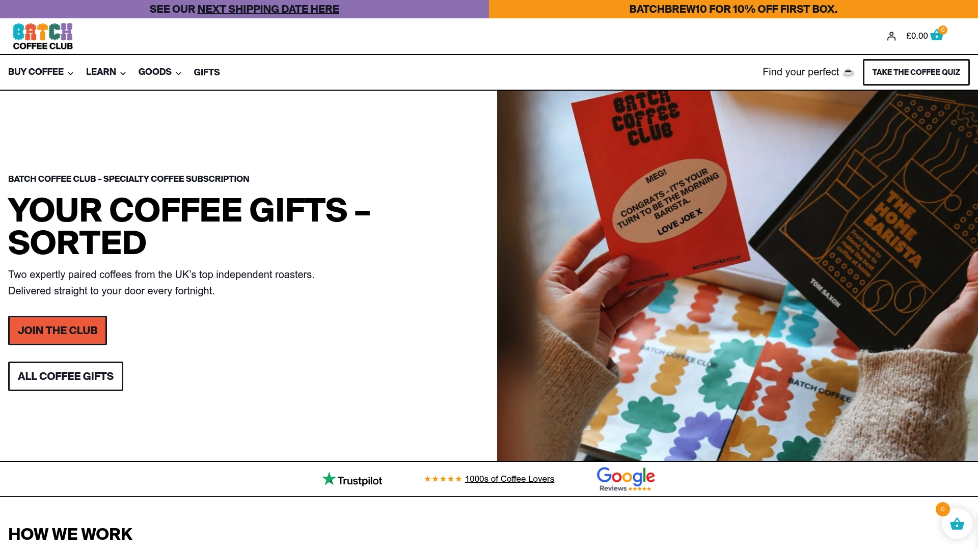 Batch Coffee Club delivers two specialty coffees per box from independent UK roasters every two weeks, wrapped in fully compostable packaging. It suits buyers who value ethically sourced beans and clear provenance information with a simple subscription model.