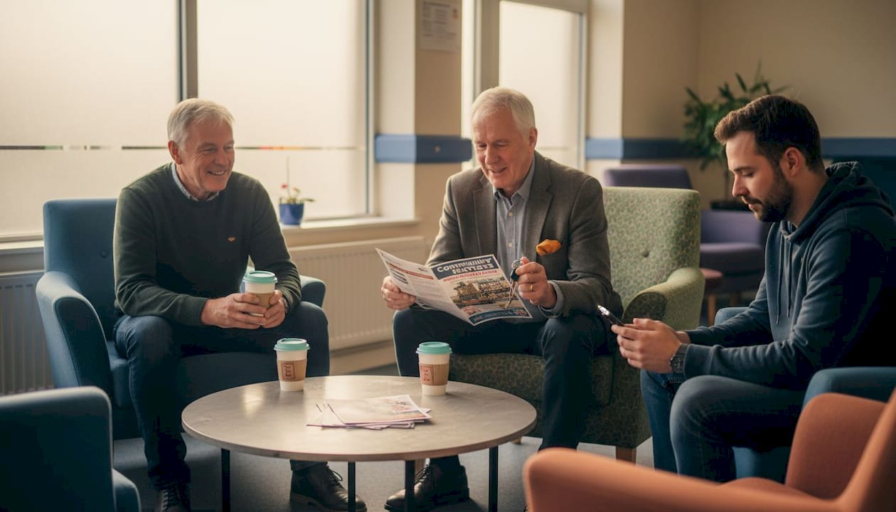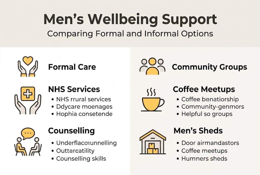 Mental wellbeing support for men in the UK looks nothing like most people expect. Forget the image of a GP referral or a therapist's couch — a growing number of men are finding their footing through coffee catch-ups, peer groups, and community initiatives that barely mention the words "mental health" at all. Men's wellbeing groups are growing in part because they use "health by stealth", wrapping genuine support inside everyday activities like woodworking and coffee meetups. This guide cuts through the noise and gives you a clear picture of your options, from NHS pathways to a simple cup with a stranger who gets it.