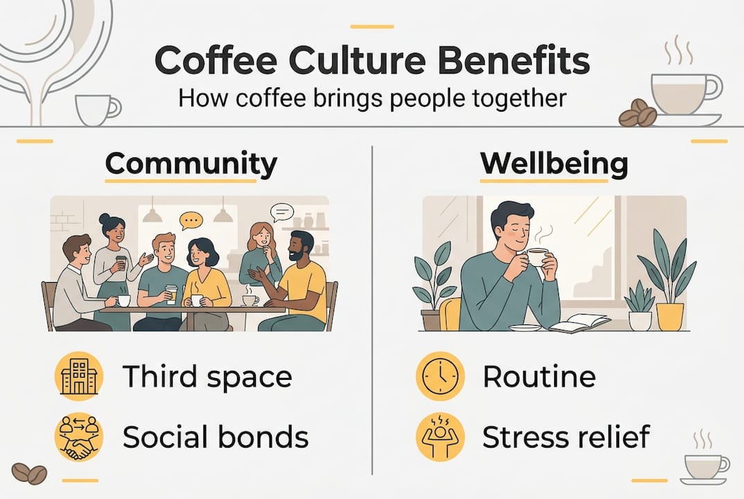 Coffee culture fosters social connection, routine, and mindfulness, which can reduce stress and lower risks of depression and anxiety. Moderate daily intake is also directly associated with reduced incidence of both conditions.
